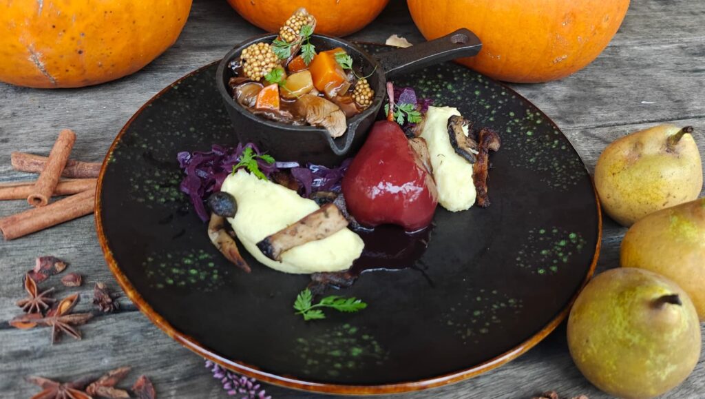 Hazenpeper! Geserveerd met gesmoorde rode kool, romige aardappelpuree, stoofpeer, gebakken bospaddenstoelen en mosterdzaadkaviaar.