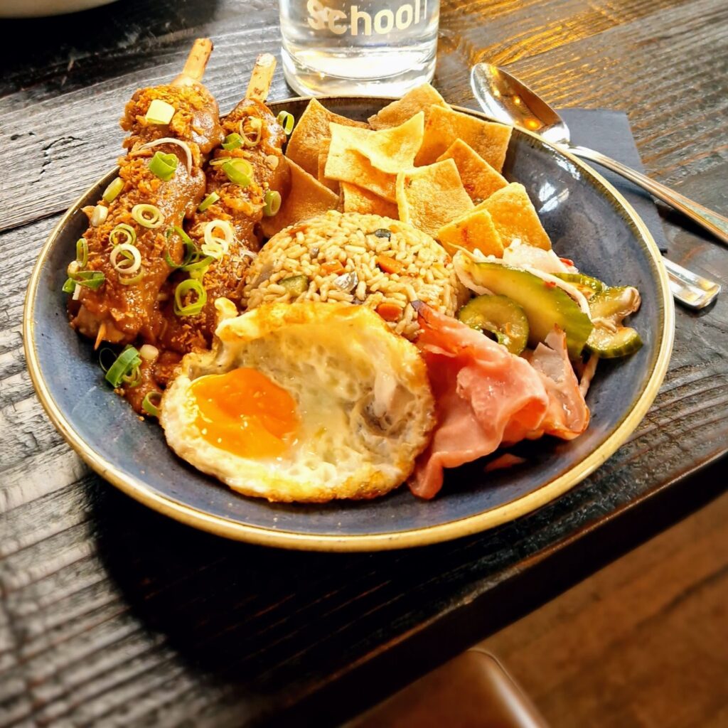 Deze week als Oude School Maaltijd; Nasi goreng, 2 stokjes kipsaté, satésaus, gebakken uitjes, komkommeratjar, seroendeng, kroepoek, plakkie ham, gebakken eitje.