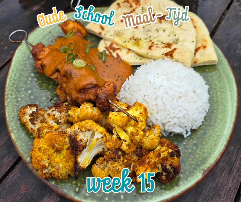 Buttermilk chicken spiesjes Geroosterde bloemkool, homebaked naan, kardemomrijst Licht pittig gemarineerde kippendij, geserveerd met kruidige rijst, geroosterde bloemkool en vers gebakken naanbrood.