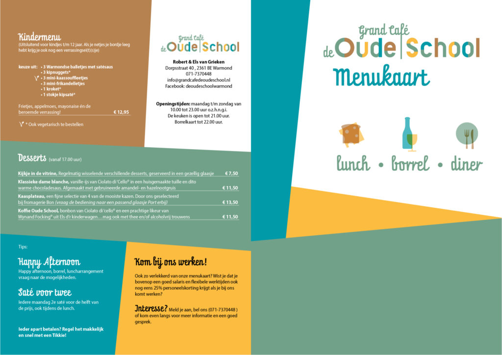 Reserveer op tijd je tafel. Mail hiervoor naar info@grandcafedeoudeschool.nl