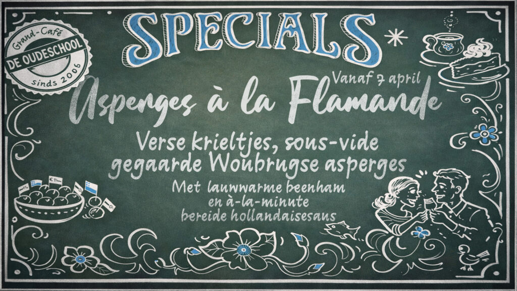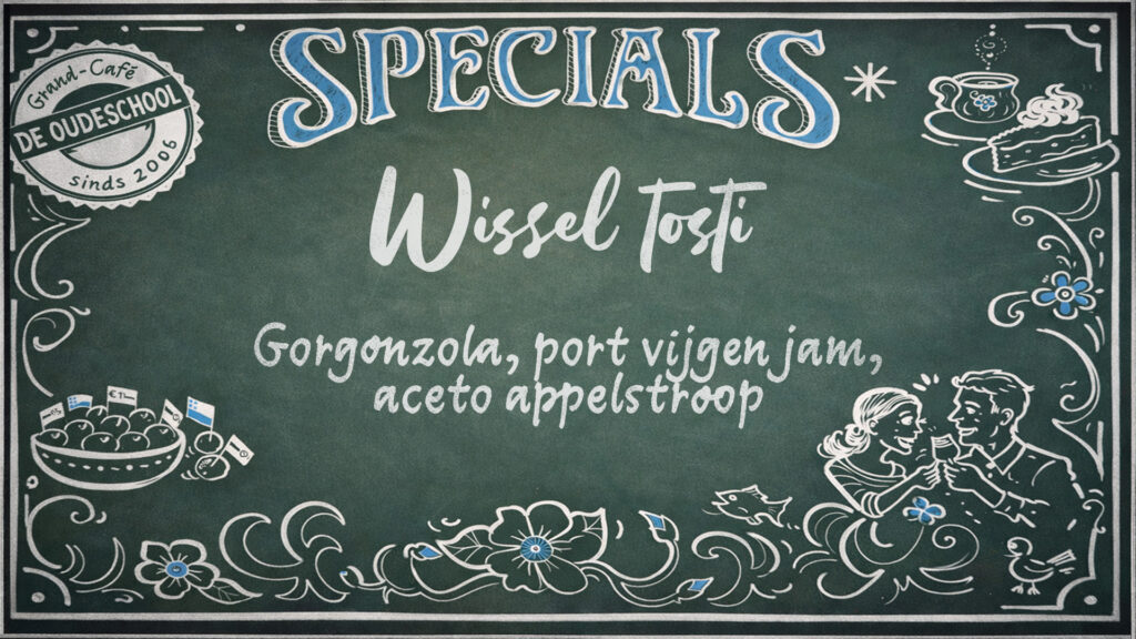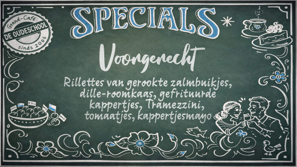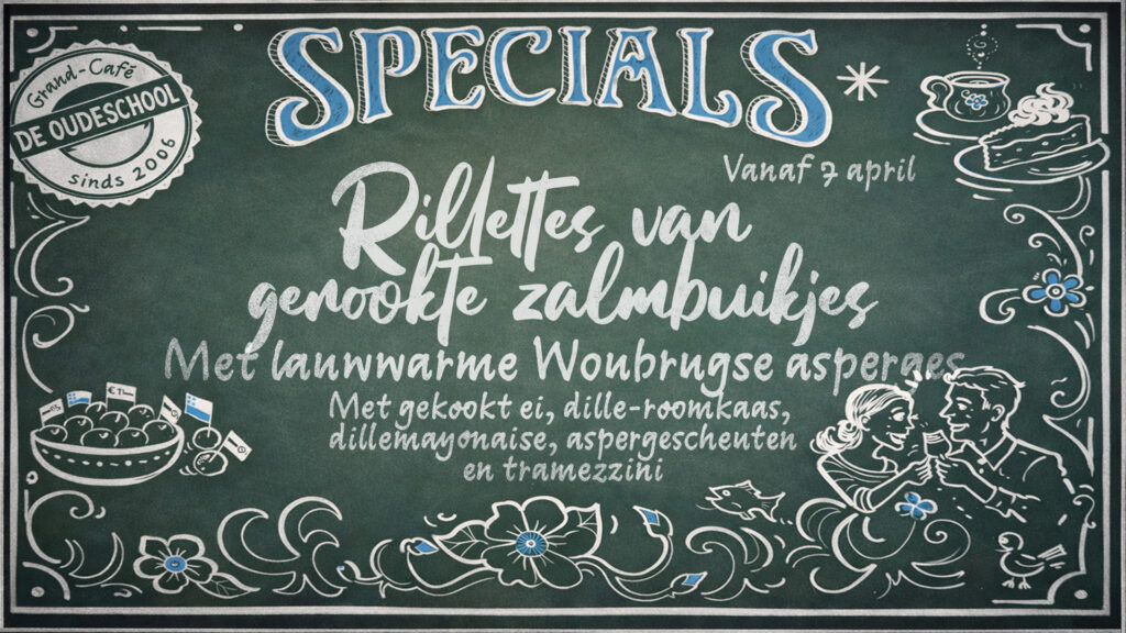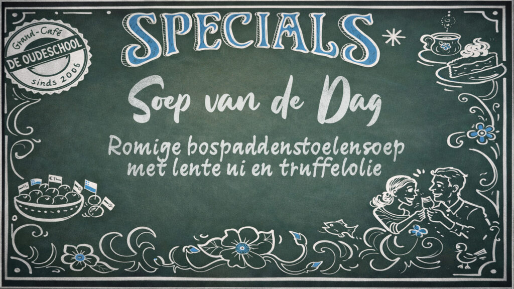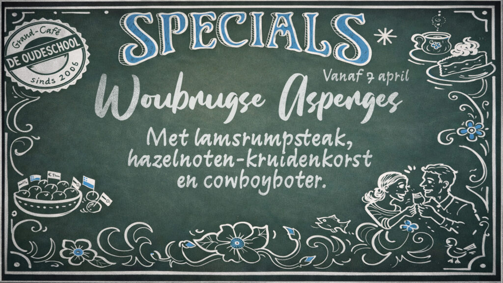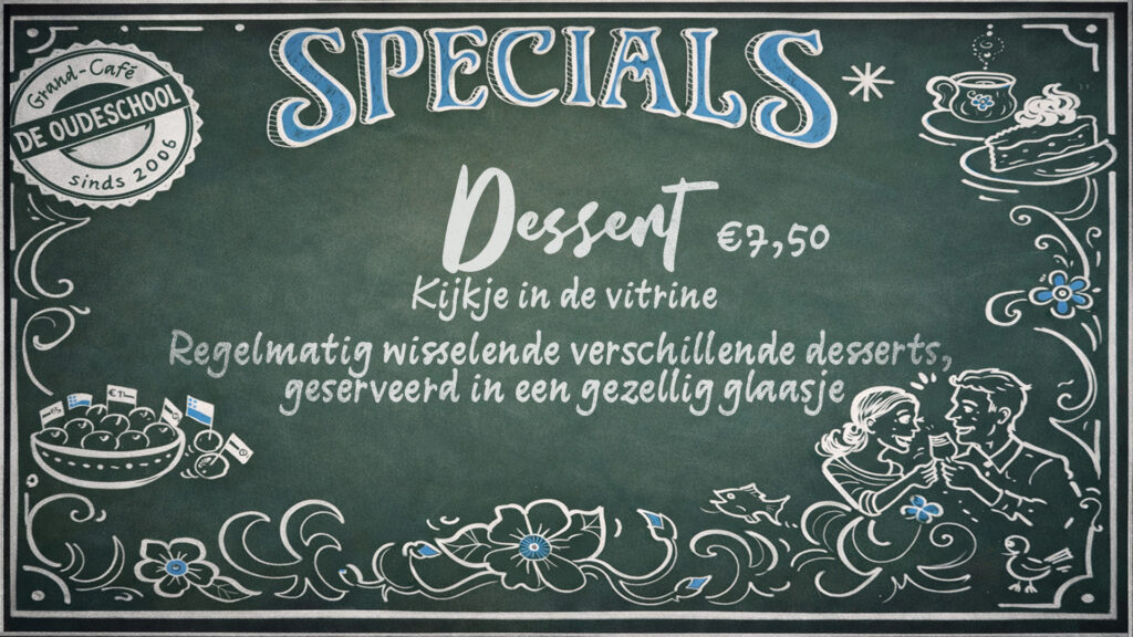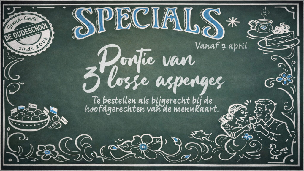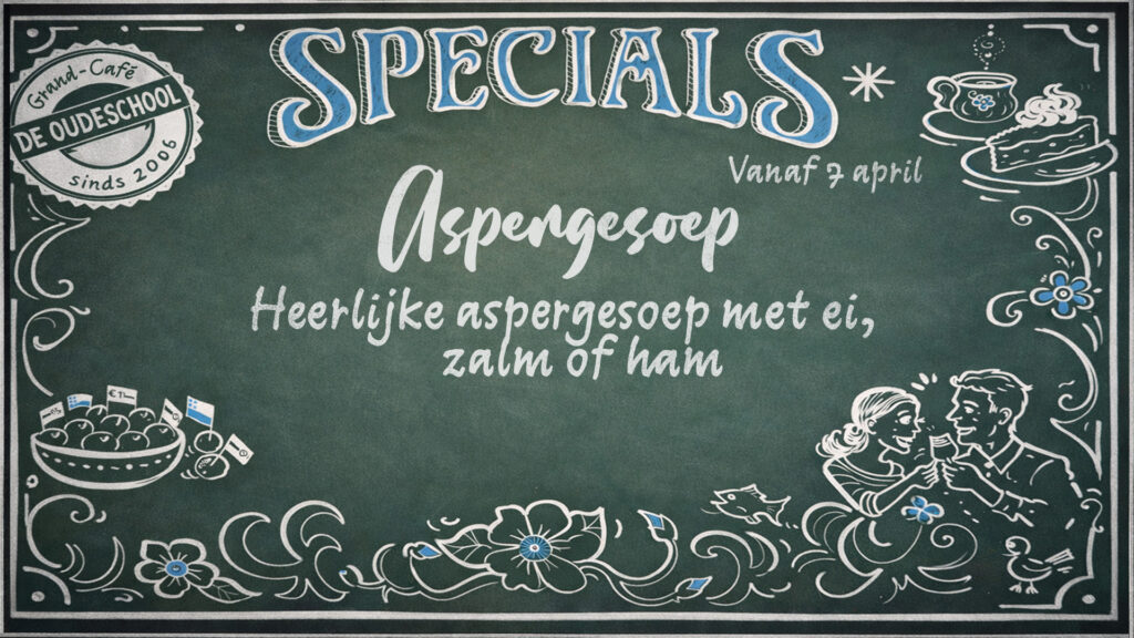 Reserveer op tijd je tafel. Mail hiervoor naar info@grandcafedeoudeschool.nl