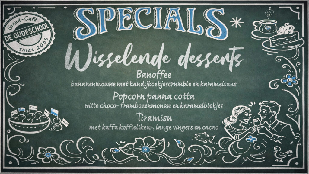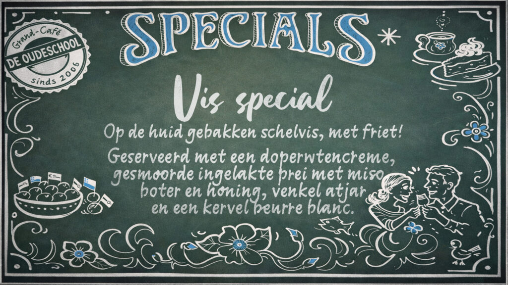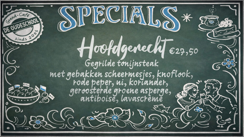 Bijna wekelijks schotelen wij je nieuwe speciale gerechten voor. Variërend van vlees, vis of vega. Net wat er in ons opkomt, of wat het seizoen ons aanbiedt. Laat je verrassen en geniet elke keer van iets anders lekkers.